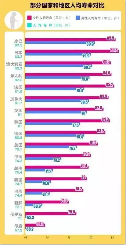 冰島憑借著男性80.9歲,女性85.5歲的人均壽命,摘得了冠軍;而同在亞洲的日本則摘得了第二名,男性79.9歲,女性86.3歲。值得注意的是,中國的人均壽命為男性73.2歲,女性79.9歲,比日本少7歲左右。